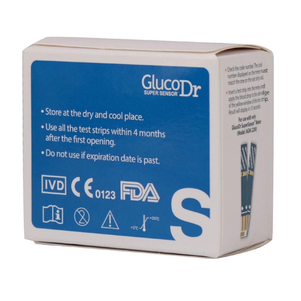 نوار تست قند خون گلوکو داکتر Gluco Dr محصولی بهداشتی- طبی ساخت کشور کره است که امکان اندازه گیری قند خون شما را در کمترین زمان و به راحتی فراهم می آورد. این مجموعه یک پکیج 50 عددی نوار تست قند خون می باشد که در دو قوطی درب دار 25 تایی مجزا ارائه شده اند تا در برابر رطوبت، دما و آلودگی های احتمالی محفوظ باشند. این نوارها برای استفاده شخصی و به صورت یکبار مصرف هستند و دارای الکترودهایی با روکش طلا می باشند تا در هر شرایط محیطی نتایج معتبری به شما ارائه دهند. دمای مناسب برای نگهداری از این محصول از 1 تا 32 درجه سانتی گراد می باشد. میزان حجم خون مورد نیاز برای اندازه گیری در حدود 2 میکرو لیتر می باشد و زمان عملکرد آن نیز تقریباً 10 ثانیه است.