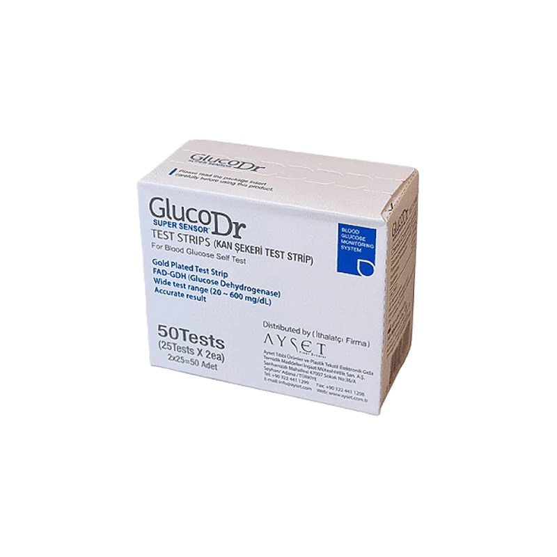 نوار تست قند خون گلوکو داکتر Gluco Dr محصولی بهداشتی- طبی ساخت کشور کره است که امکان اندازه گیری قند خون شما را در کمترین زمان و به راحتی فراهم می آورد. این مجموعه یک پکیج 50 عددی نوار تست قند خون می باشد که در دو قوطی درب دار 25 تایی مجزا ارائه شده اند تا در برابر رطوبت، دما و آلودگی های احتمالی محفوظ باشند. این نوارها برای استفاده شخصی و به صورت یکبار مصرف هستند و دارای الکترودهایی با روکش طلا می باشند تا در هر شرایط محیطی نتایج معتبری به شما ارائه دهند. دمای مناسب برای نگهداری از این محصول از 1 تا 32 درجه سانتی گراد می باشد. میزان حجم خون مورد نیاز برای اندازه گیری در حدود 2 میکرو لیتر می باشد و زمان عملکرد آن نیز تقریباً 10 ثانیه است.